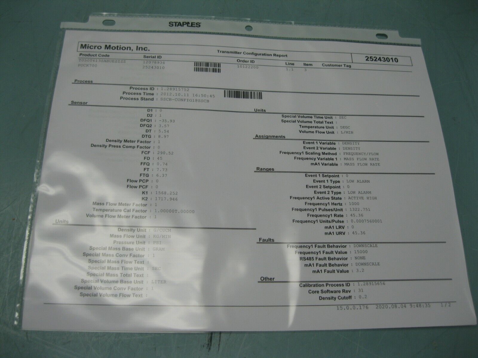 1/2" 150# Micro Motion T050 Flow Sensor 700 Core Processor CALIBRATED H15 (2681) quantity