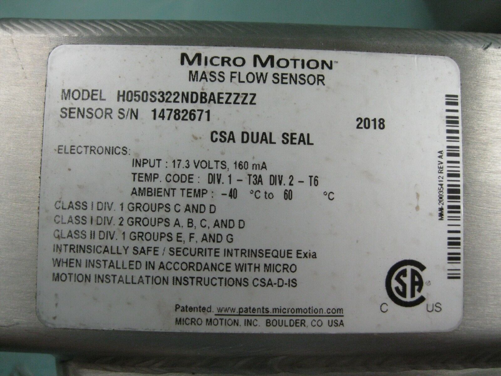 3/4″ Micro Motion H050 S322NDBAEZZZZ Mass Flow Sensor w/ 700 Core Processor C7