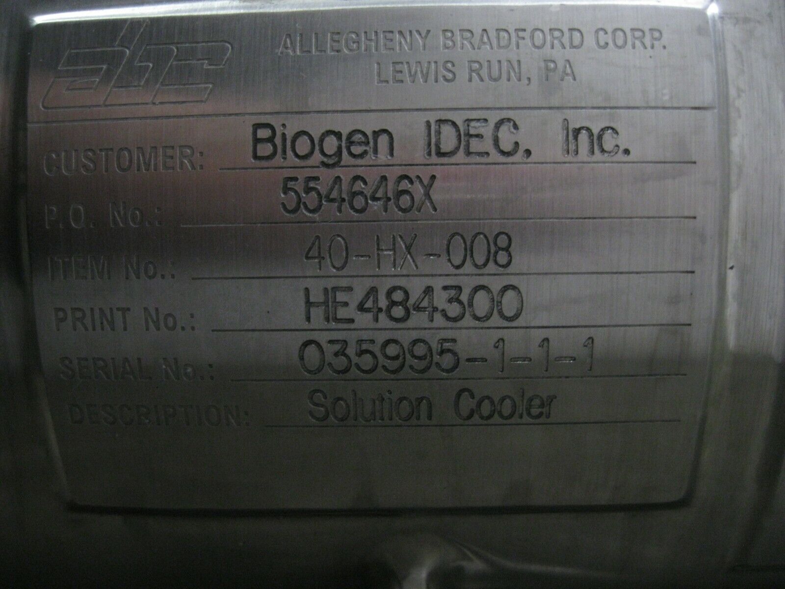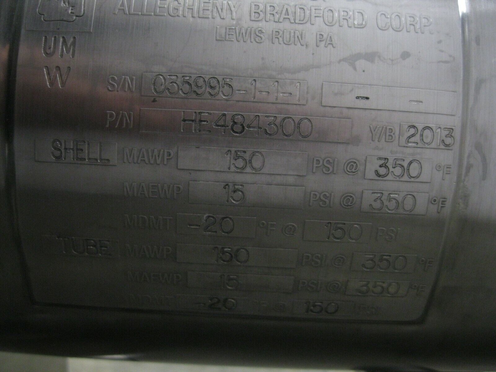 Allegheny Bradford SS HE484300 Heat Exchanger Z18 (2996)