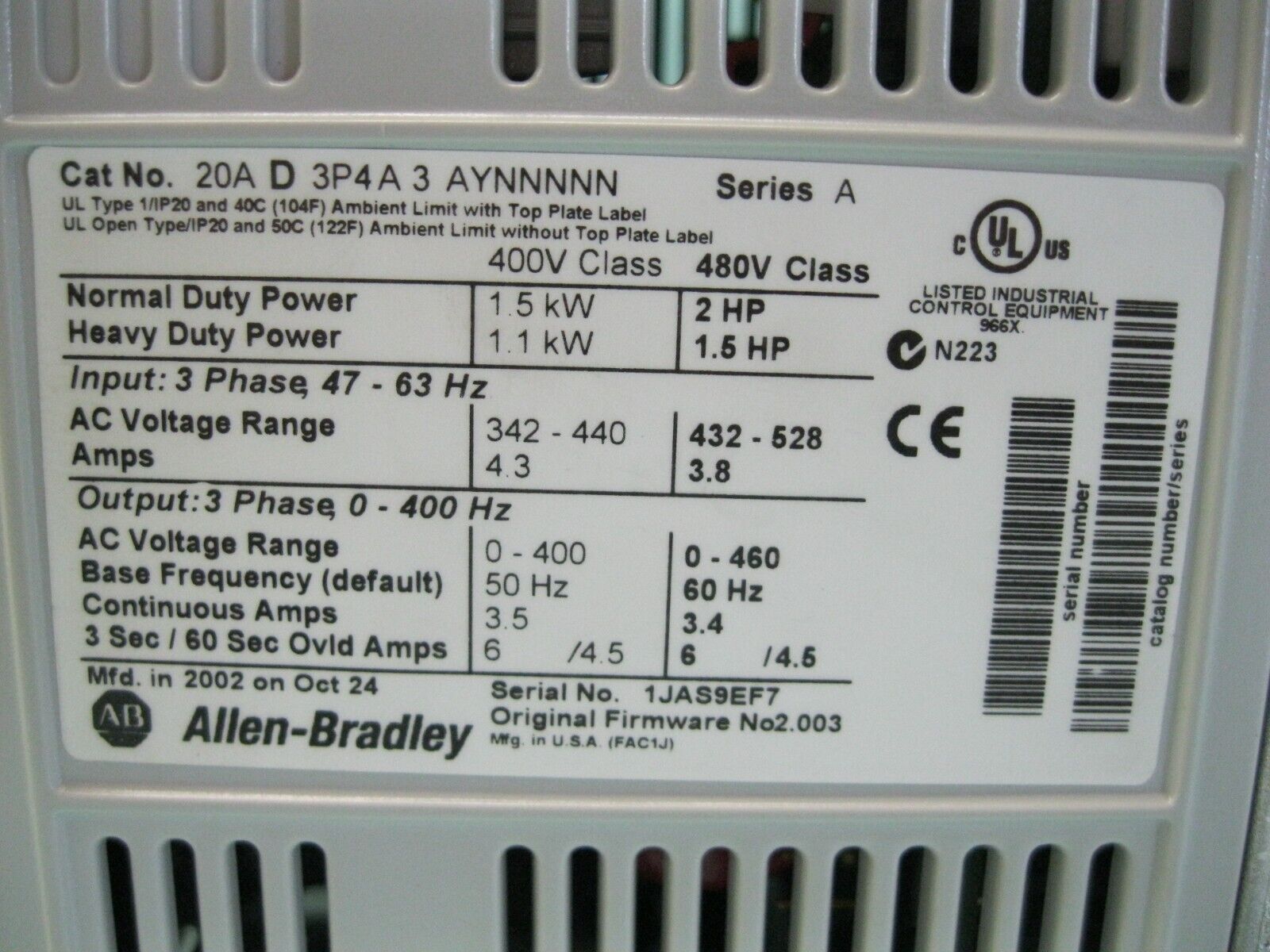 Allen-Bradley 20A-D3P4A3AYNNNNN Ser A Powerflex 70 2 HP AC Drive E18