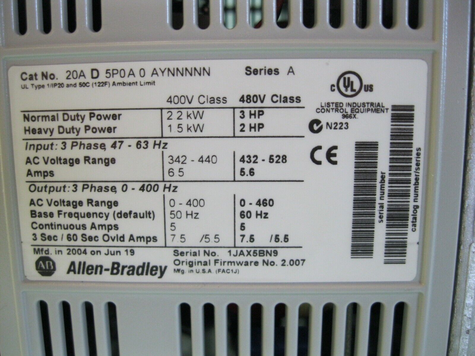 Allen-Bradley 20A-D5P0A30AYNNNNN Ser A Powerflex 70 3 HP AC Drive D7