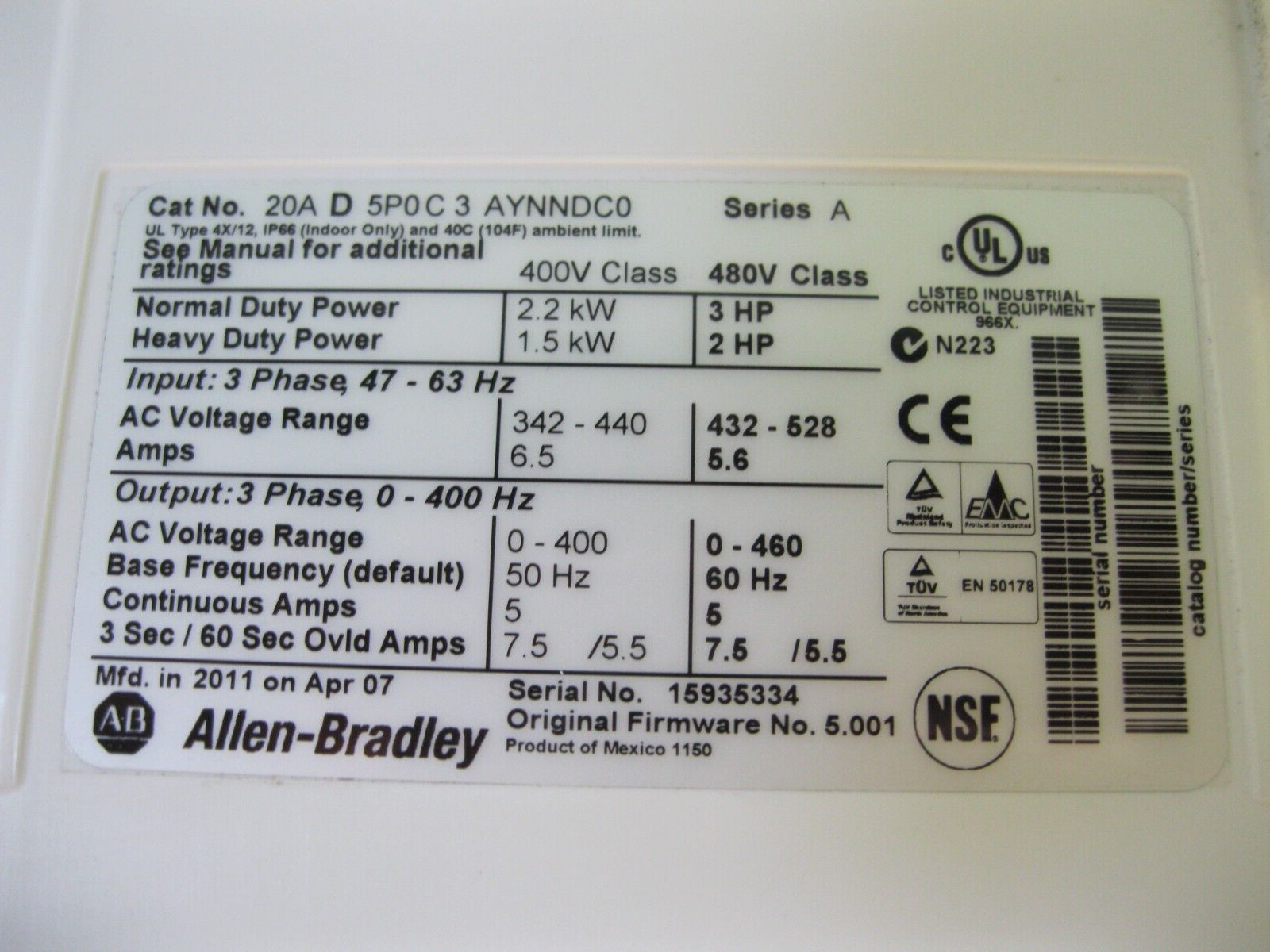 Allen-Bradley 20A-D5P0C3AYNNDC0 Ser A Powerflex 70 3 HP AC Drive G14
