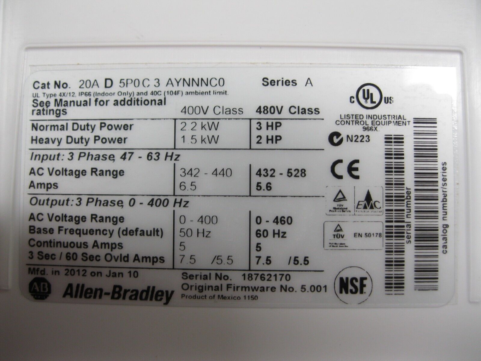 Allen-Bradley 20A-D5P0C3AYNNNC0 Ser A Powerflex 70 3 HP 480V AC Drive H14 quantity