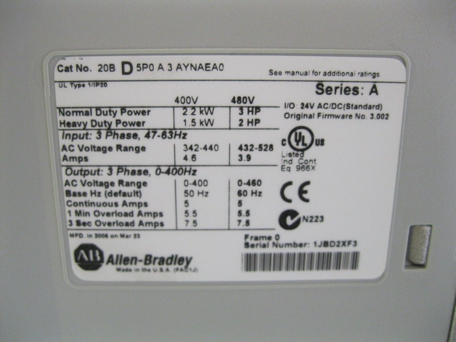 Allen-Bradley 20B-D5P0A3AYNAEA0 Ser A 3 HP Powerflex 700 AC Drive D6