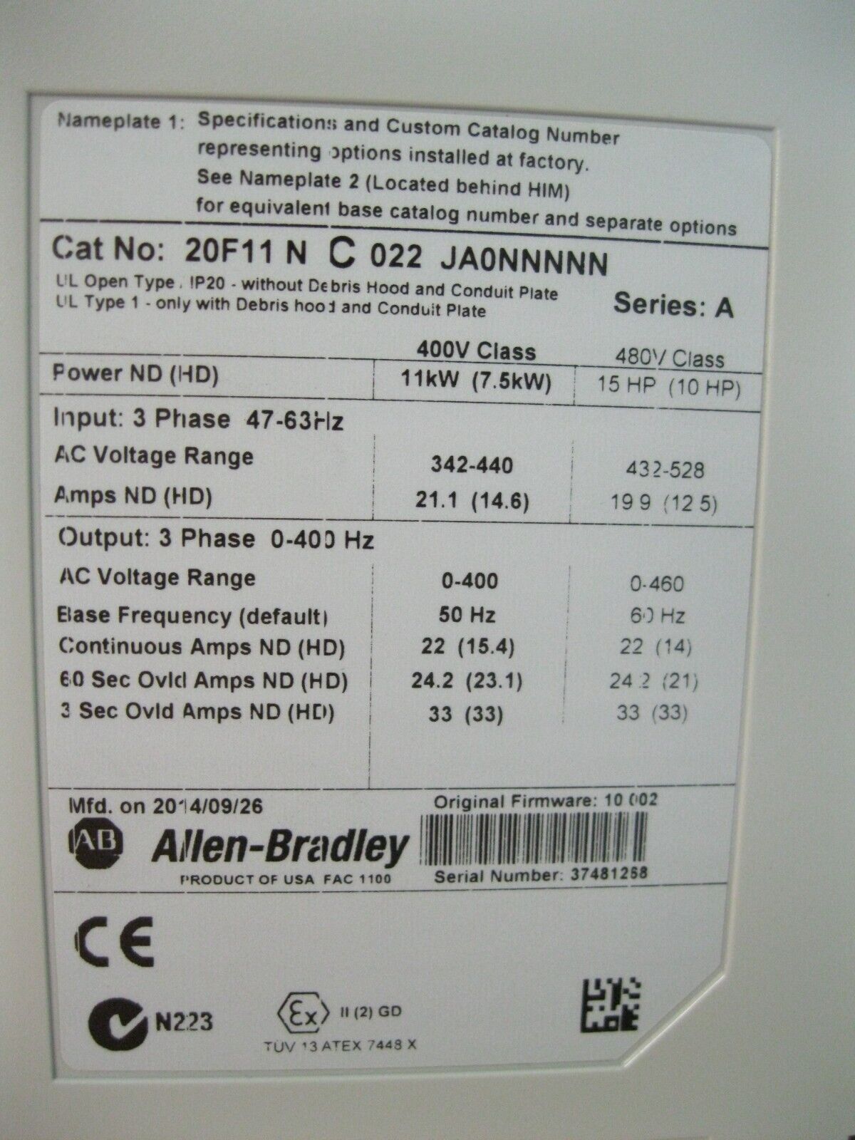 Allen-Bradley 20F-11NC022JA0NNNNN Ser A 15 HP Powerflex 753 AC Drive G6 quantity