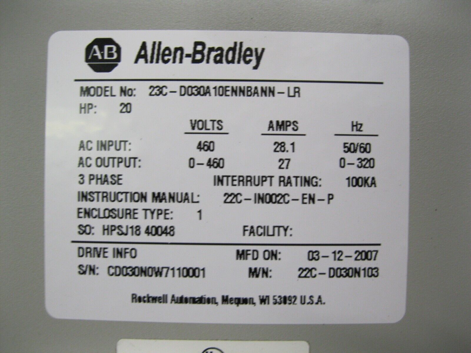 Allen-Bradley 22C-D030N103 Ser A Powerflex 400 20 HP AC Drive w/23C Package Z32 quantity