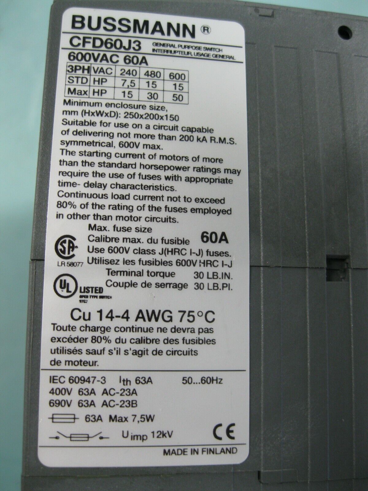 Bussmann CFD60J3 Rotary 600 VAC 60A Disconnect Switch H18 (2639)