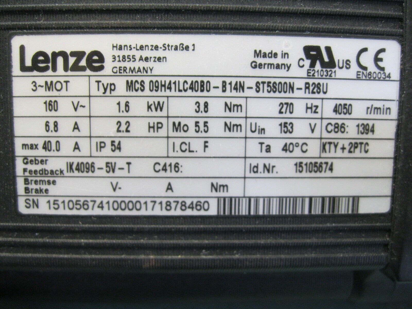 Lenze MCS 09H41LC40B0 2.2 HP Servo Motor G2 (2986)